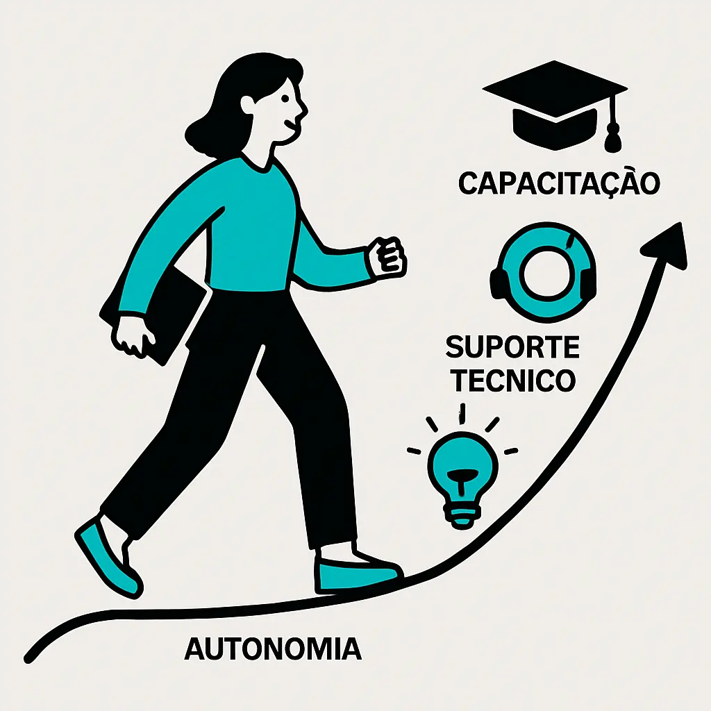 O sucesso de qualquer tecnologia depende de quem a utiliza. Por isso, nosso compromisso se materializa no apoio contínuo ao docente, através de capacitações que geram confiança e autonomia, e um suporte técnico que garante que ninguém fique desamparado.